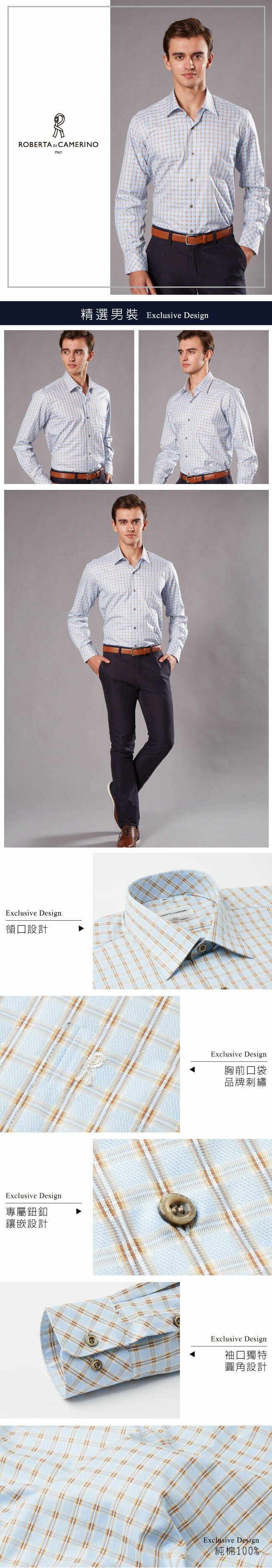 純棉經典格紋咖啡藍長袖襯衫